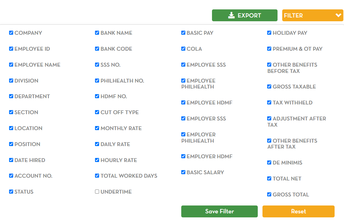 You can filter the data shown in the reports. Tick the box to show the data. Save Filter to save changes. Click reset to show the original filter.