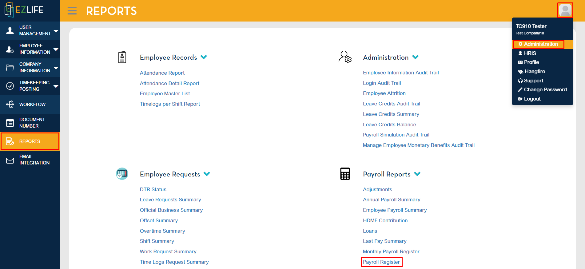 To check the payroll register report, click the profile icon in the upper-right corner of the page, go to Administration - Reports - Payroll Reports - Payroll Register