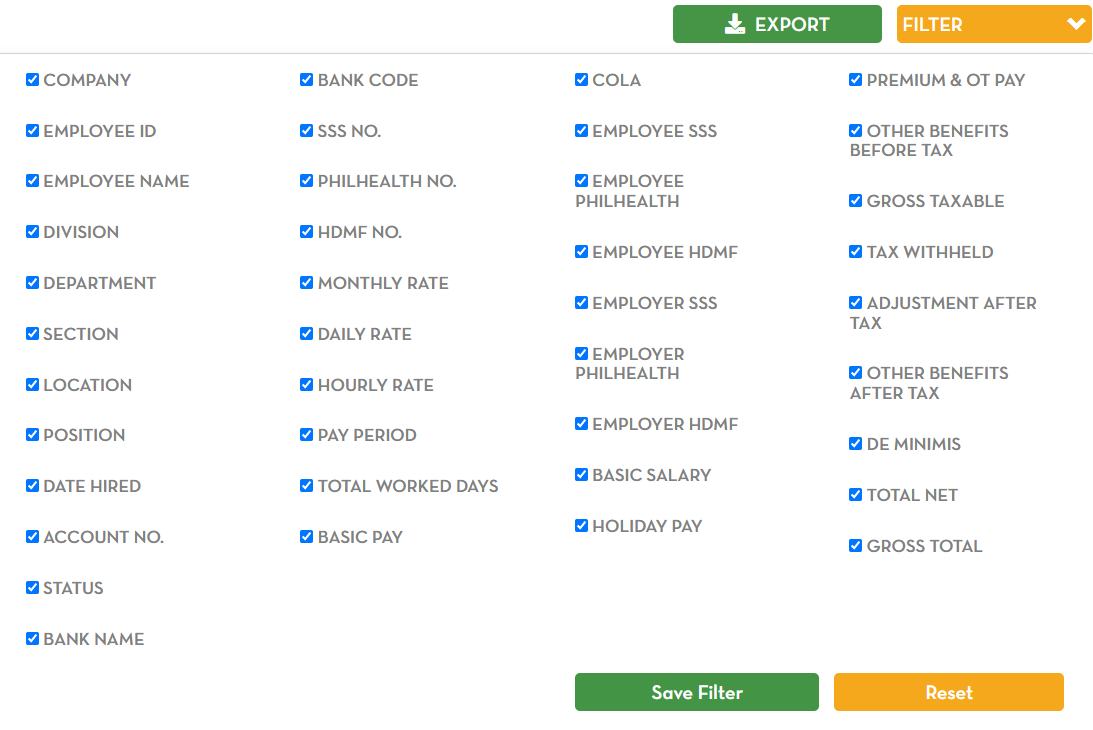You can filter the data shown in the reports. Tick the box to show the data. Save Filter to save changes. Click reset to show the original filter.