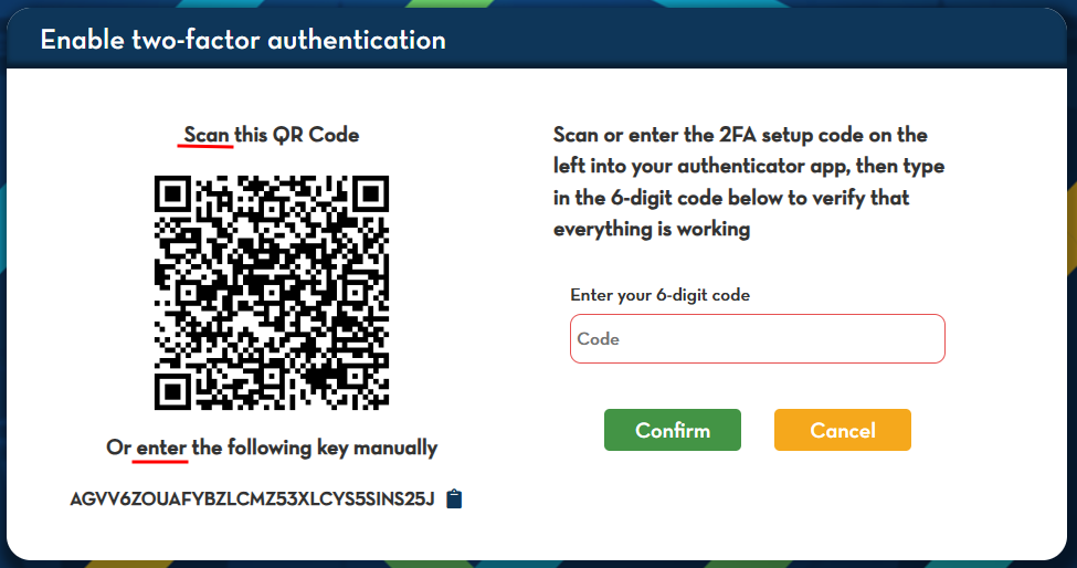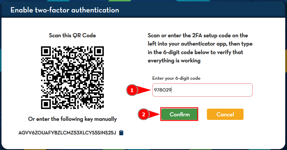 5. The app will generate a 6-digit code. Enter the code in the system and click Confirm.