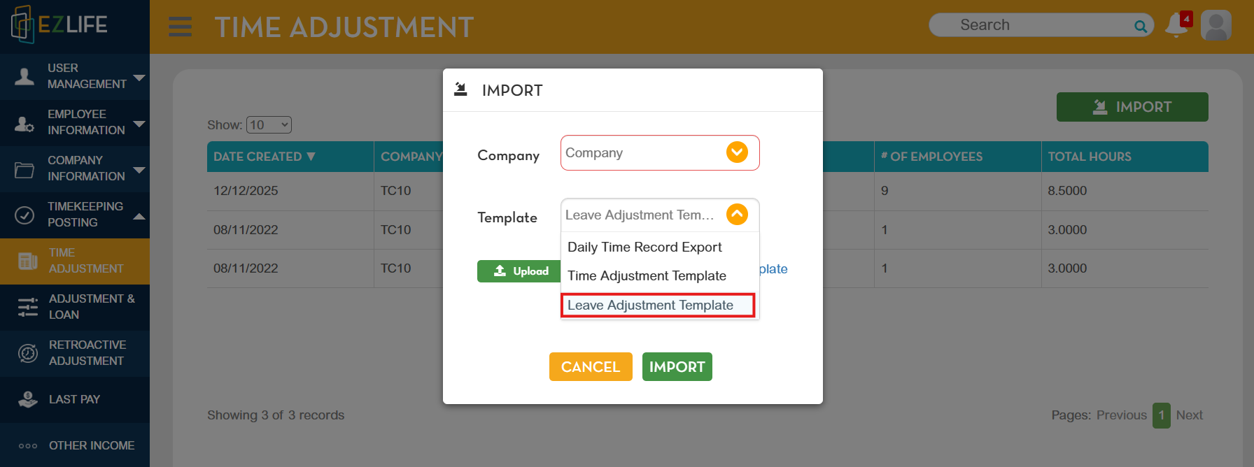 A Leave Upload feature is now available in the Time Adjustment Module, enabling users to upload leave adjustments in bulk for payroll simulation purposes.